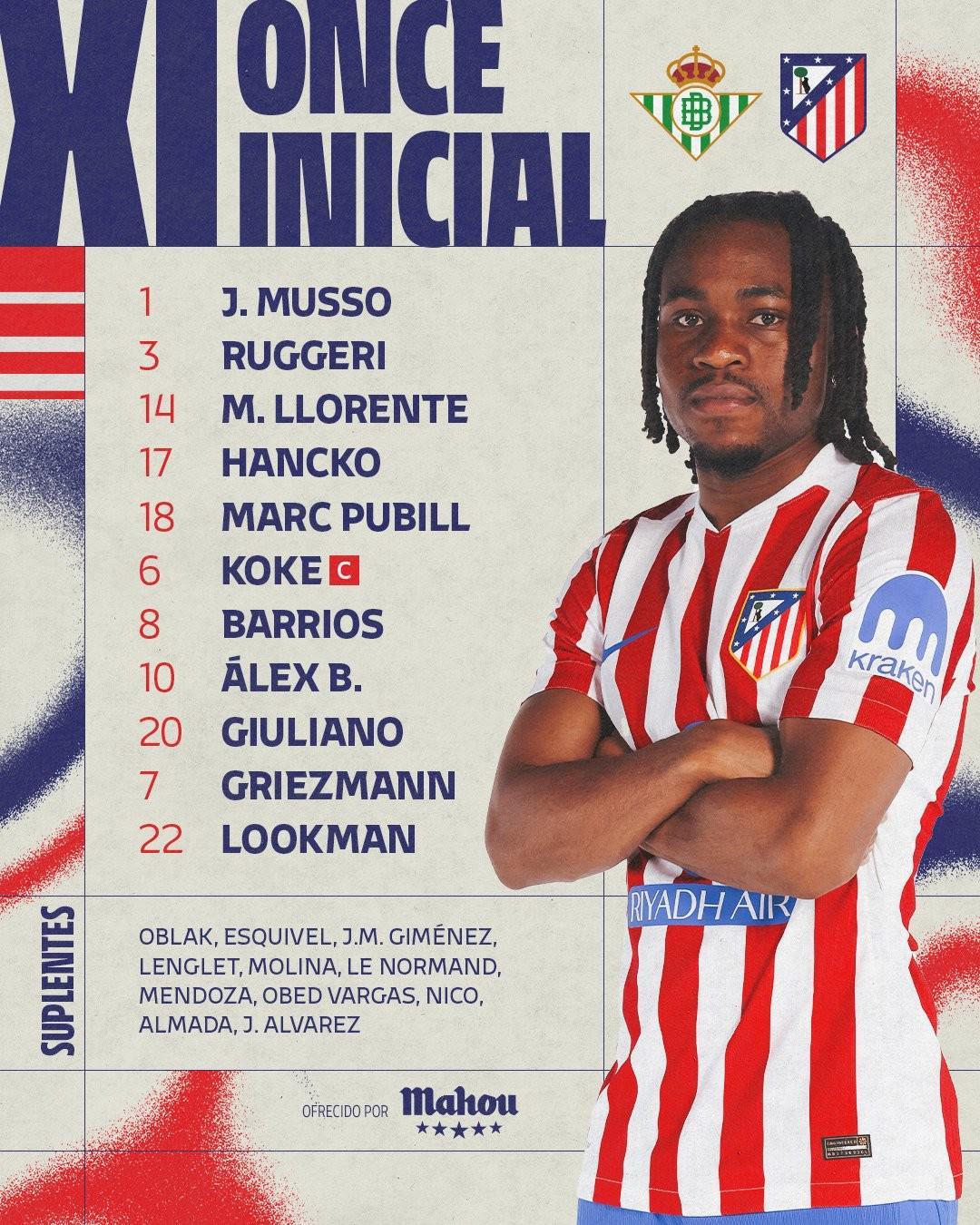 马德里竞技即将在西班牙国王杯1/4决赛客场挑战皇家贝蒂斯,目前他们已经公布了本场比赛的首发阵容。